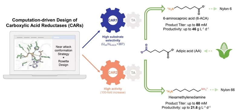 Recently, the research group of Professor Xu Jianhe from the National Key Laboratory of Bioreactor Engineering, ECUST, in collaboration with Professor Yu Huilei, leveraged AI-powered rational protein design technology to remodel the active center of carboxylic acid reductase, significantly enhancing its activity and substrate specificity. The study successfully applied this redesigned enzyme to the biosesynthesis of monomers for Nylon 6 and Nylon 66 (1,6-hexanediamine and 6-aminocaproic acid). The research article was published in Science Advances, a subsidiary journal of Science, under the title “Computation-driven redesign of an NRPS-like carboxylic acid reductase improves activity and selectivity”.